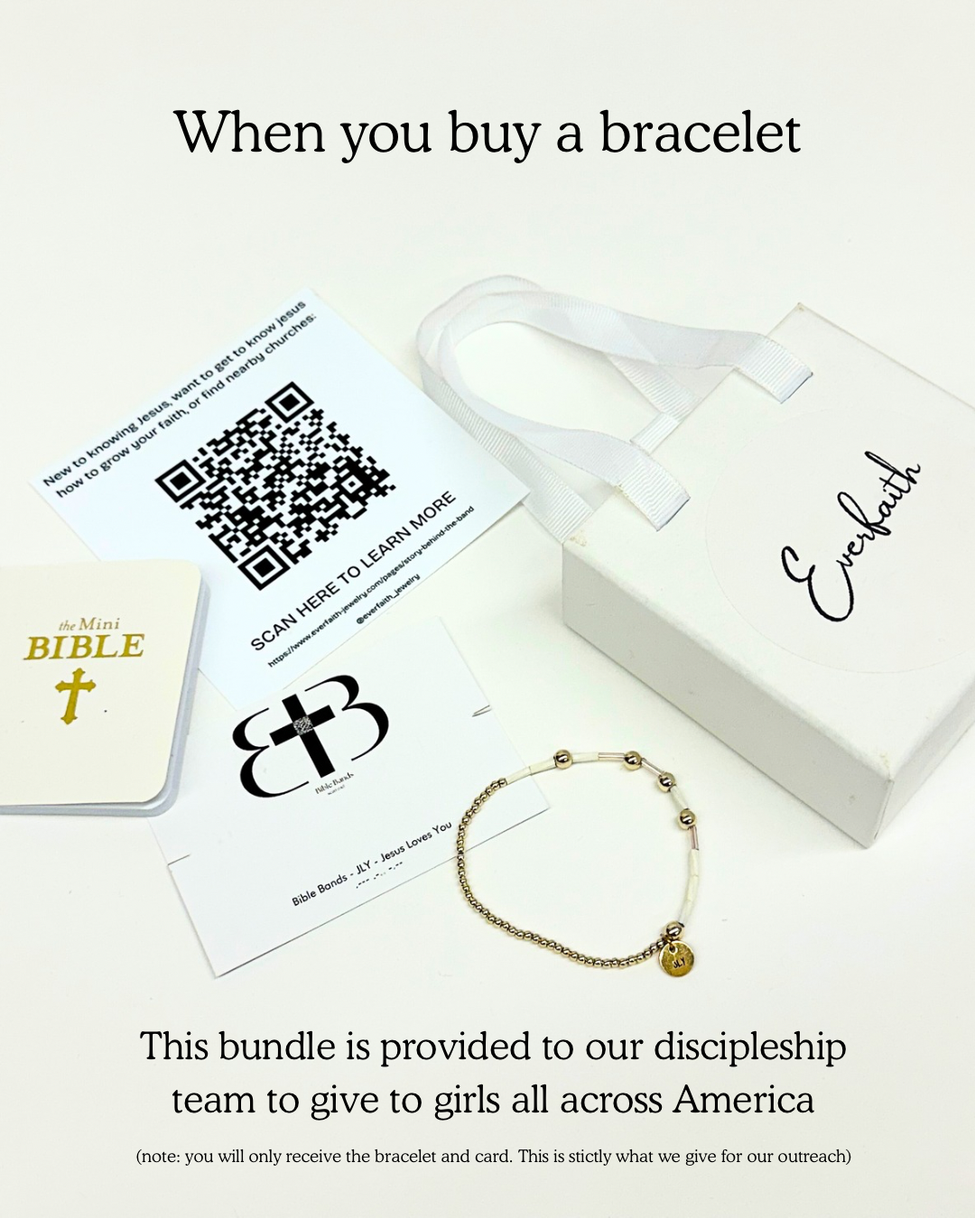 A mini Bible, bracelet, and QR code is given on campuses and communities because of your purchase. The QR code includes information to find out about Christ, grow in Christ, and find churches near them.